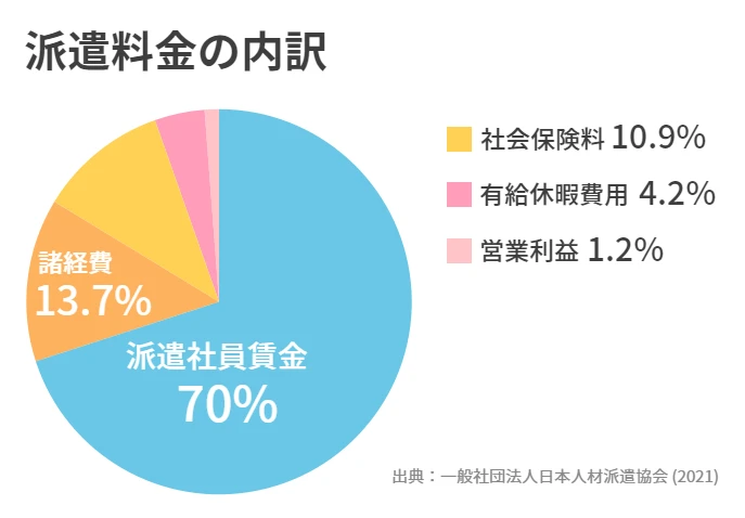 平均的な契約では、約30%のマージン率を引いた額が派遣社員の給与として支払われる (画像) 。しかし、このマージン率は、派遣される職種などによって20%~50%以上になることもある。